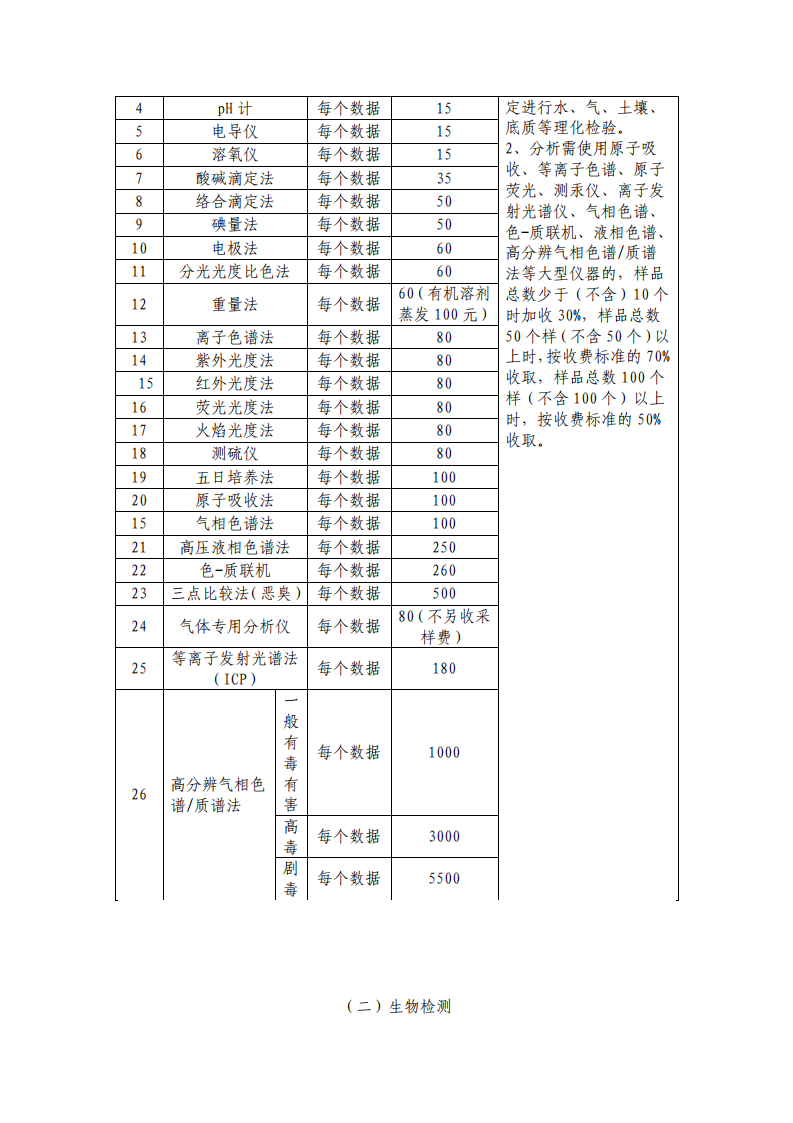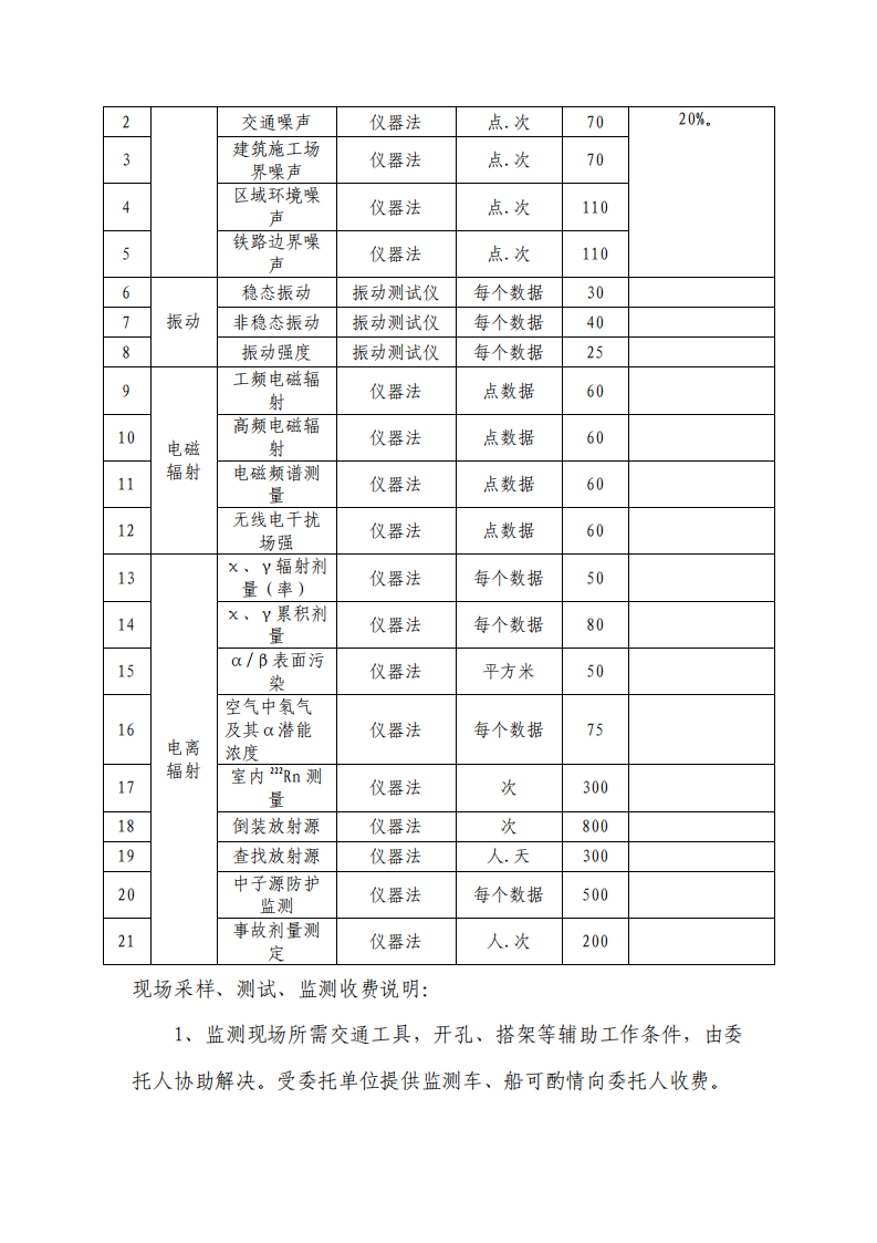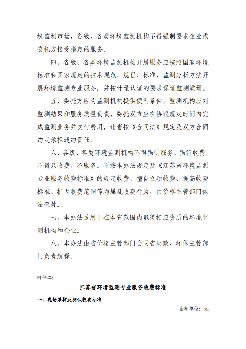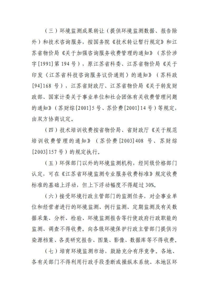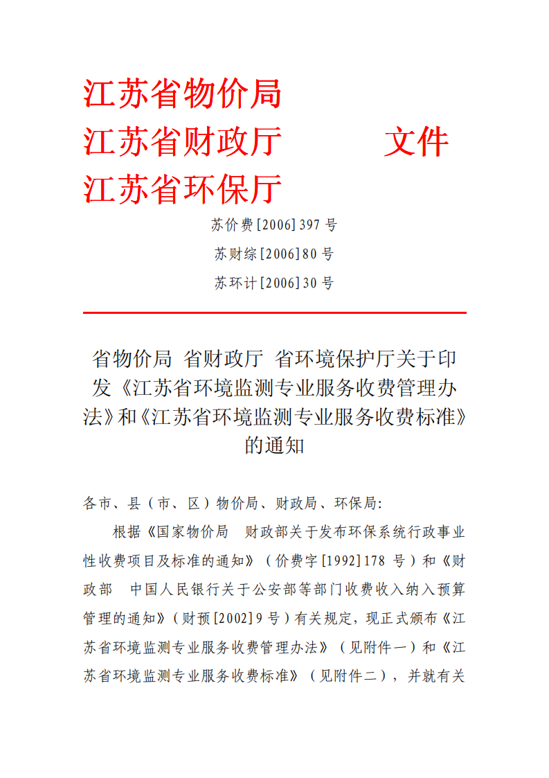 按蘇價費〔2006〕397 號中《江蘇省環境監測專業服務收費標準》指導價的4.0-6.0折計算;車輛、人員費另行計算。